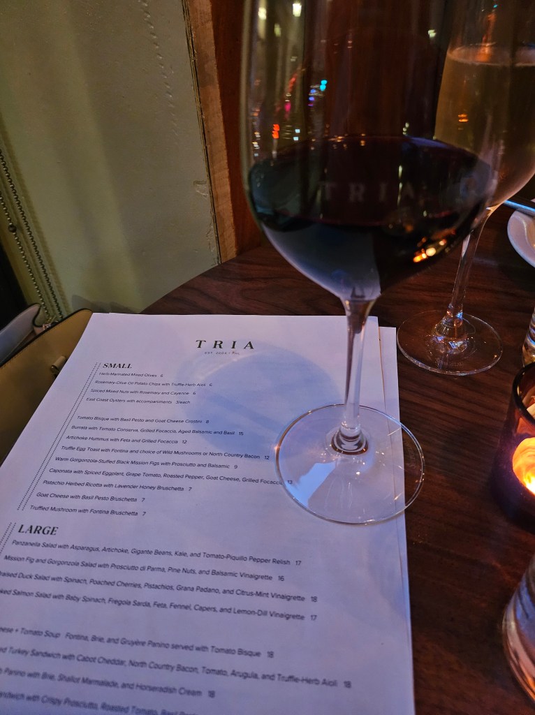 Tria is called a wine bar, so what a more appropriate drink to order than a glass of wine! I don’t know how often they rotate wines but I ordered the bold Shiraz, Farm to Table, Fowles, ’21, which is described on the menu as “Victoria, Australia Plush and full; black currants, berries and plum with baking spices to finish.” Which I highly recommend it you’re looking for a wine that’s closer to dry on the wine spectrum.