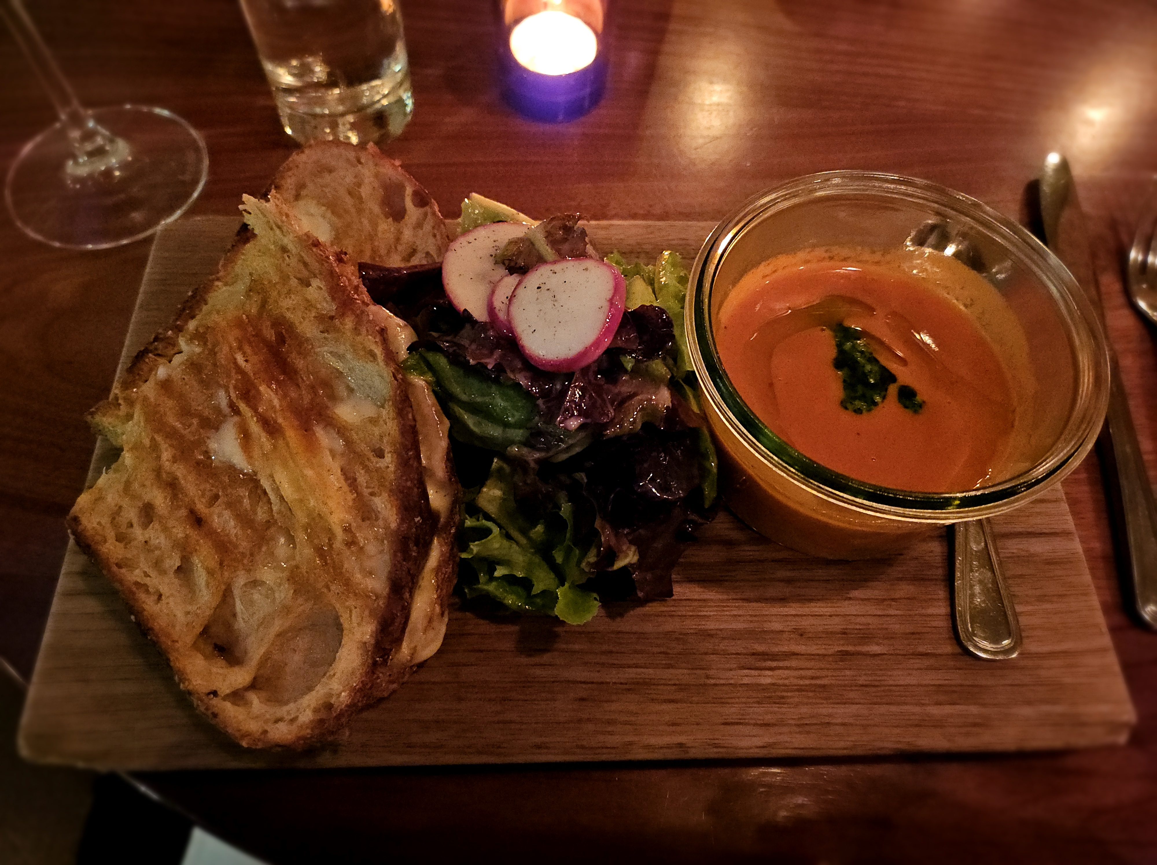 For our main courses, my friend had ordered the Braised short rib sandwich which was toped with a soft cheese, shallot marmalade, and horseradish. I had gotten the Grilled Cheese Sandwich with tomato soup and both dinners came with their own side salad. While this may be an item that you find on the kids menu, it does a wonderful job satisfying those adult taste buds and making you feel cozy on the inside. The sandwich included Fontina, Brie, and Gruyère between two perfectly toasted pieces of rye bread, giving you that satisfying crunchy outside and warm cheesy inside. For those who are concerned (me, I’m those) the cheese pull is phenomenal! It’s not chasing after you as you try to put the sandwich back on the plate, it’s just melted enough to watch as you take your bite and pull away from the sandwich for it to break.