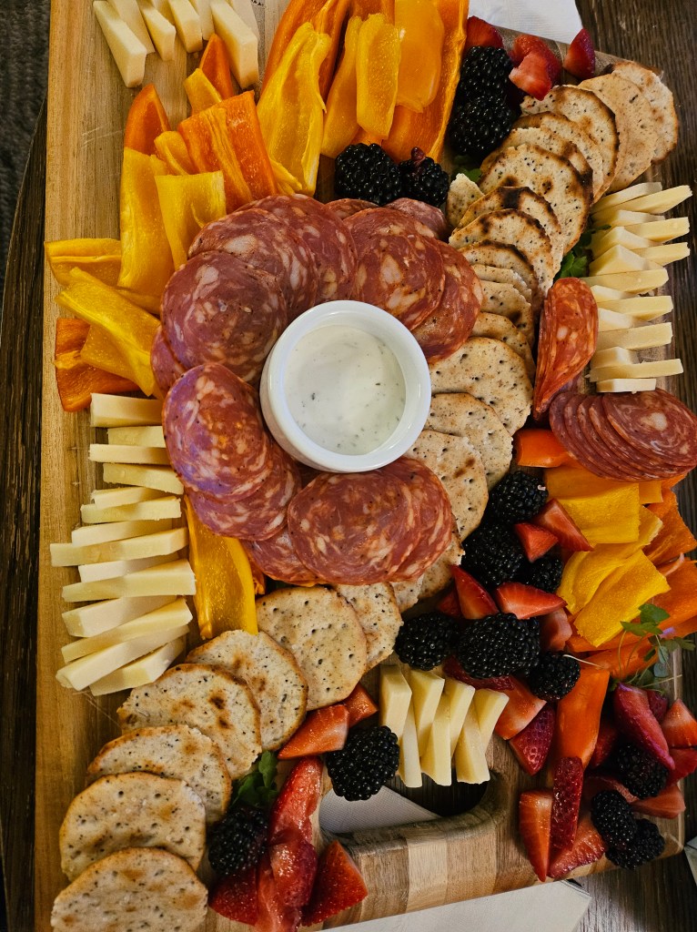 For sustenance we had a homemade charcuterie board, which is my specialty and go to for any party. In all honesty, I just really want an excuse to eat a lot of cheese and pepperoni. I always try to balance out my boards, so if I have one meat options, I’ll have one option of everything else cheeses, fruits, veggies, crackers, and some sort of savory thing like cashews. And when it’s 2-3 people this is usually my go to layout since I include a lot of different types of food on the board.