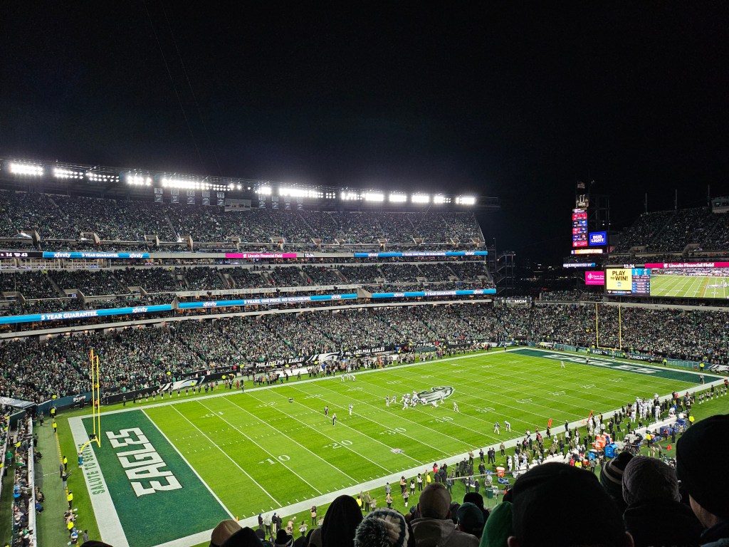It was finally my turn to get to see the Eagles at the Lincoln Financial Field! My sister is a seasons ticket holder so she will send us the Eagles home schedule when it’s released in May to pick what games we want to attend! I had chosen the Lions game since I’ve already been to an iconic Eagles v. the nasty disgusting putrid Cowboys game. Plus I know the Lions came super close to the super bowl last year so I know they would put up an interesting game. There is also no better way to spend football than in the chilly November weather. I’ve picked games in the past where it’s still early in the season and Philly still has the lingering summer heat and cloudless days. Of course, my sisters seats are in the direct sunlight! So because of that I always got super overstimulated from the heat, the rowdiness, and the fear of sunburn. I’ve had my fair share of weird tan lines form watching the Eagles play in 90 degree weather, you only really need to experience it once to learn your lesson. It was a wonderful change of pace and I got to experience a little snow flurry doing the game which was really beautiful.