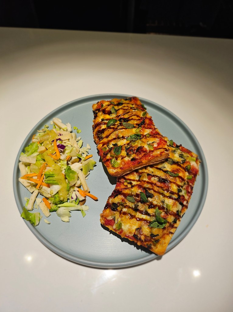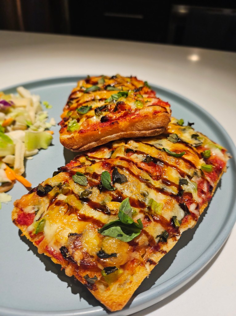 But don’t worry the recipe isn’t from scratch. In fact, it’s a simple and easy way to enjoy the iconic dish in a more personalized fashion. My pizza bread started with the basics, basil, sauce, and mozzarella. But I thought, “what would be a good way to add a little more substance to it?” Well, roasted tomatoes of course! I actually think it might have been my mother, around this time she also recommended balsamic glaze, to which I took her up on it and became obsessed with the flavor contrast the glaze drizzle added! Not until college did I start adding different toppings such as bell peppers, onions, pepperoni, and my favorite, jalapenos.